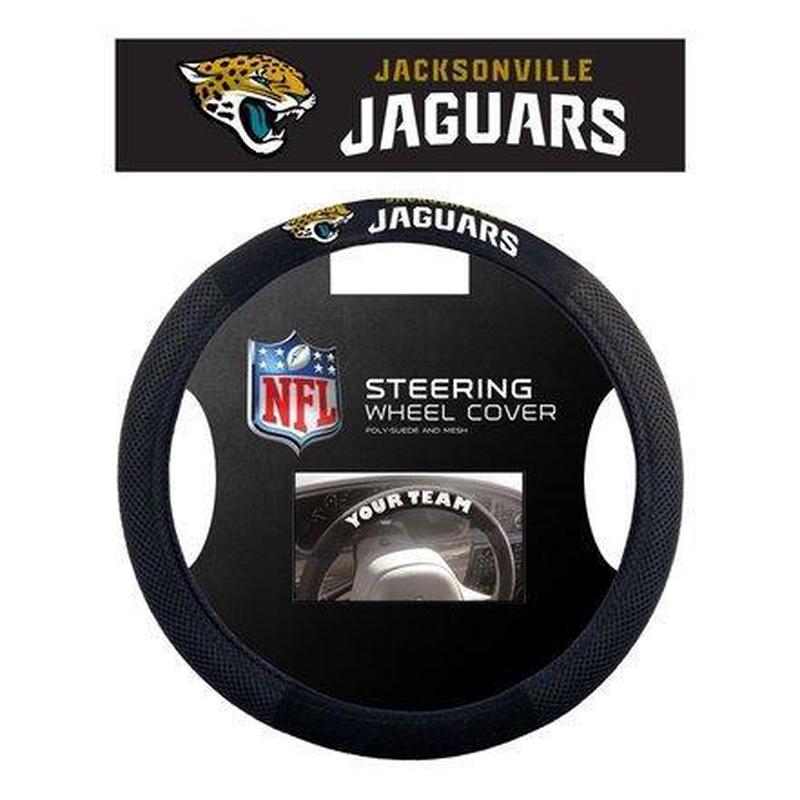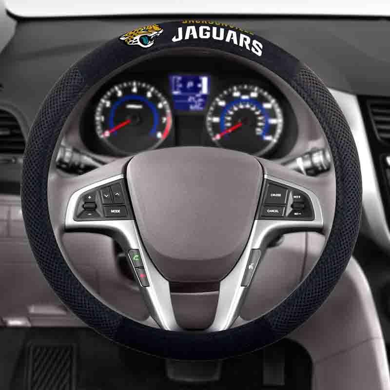 Drive in style with a high-quality NFL JACKSONVILLE JAGUARS POLY-SUEDE STEERING WHEEL COVER This cover is made of poly-suede and mesh for a comfortable grip and features your favorite team logo. It easily stretches to fit most steering wheels and slips on in seconds with no lacing required. Imported